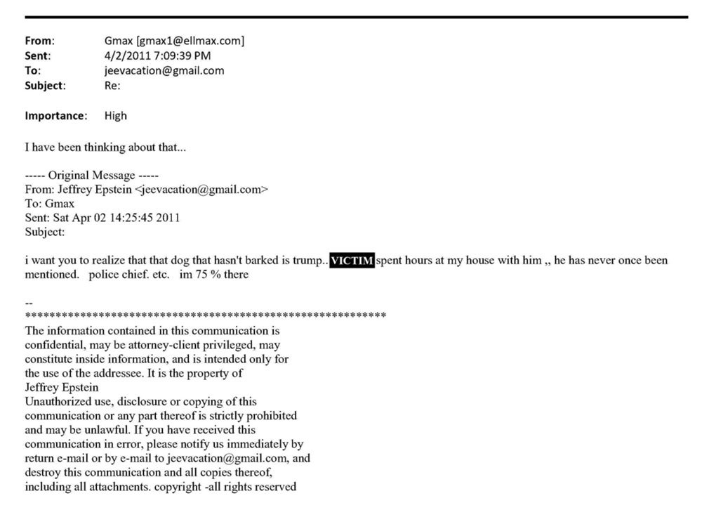 But the emails themselves tell a different story. One, from Jeffrey Epstein to Ghislaine Maxwell in April 2011, describes Trump as “the dog that hasn’t barked” and alleges that a redacted victim “spent hours at my house with him.” Epstein wrote: