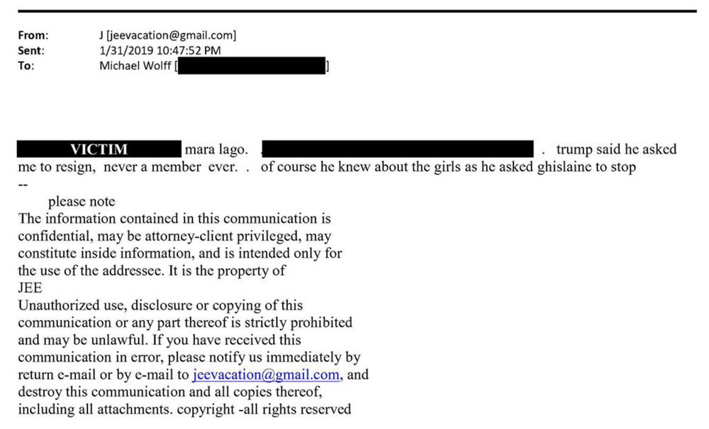 “I want you to realise that the dog that hasn’t barked is Trump. [Redacted victim’s name] spent hours at my house with him. He has never once been mentioned. police chief. etc. i’m 75% there.”