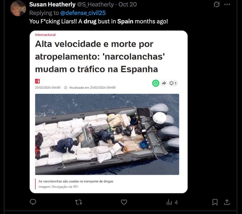 “Photo is from a drug bust in Southern Spain from over a year ago. If you are going to fucking lie at least do so convincingly,” wrote user @CmdrSeawolf, sharing the original source from El País, a major Spanish newspaper.