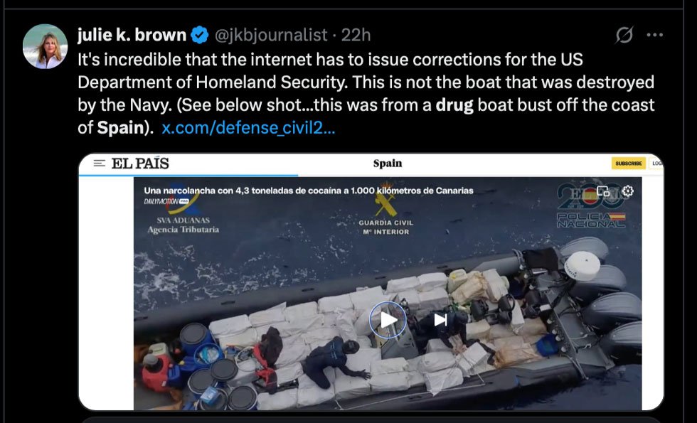 Investigative journalist Julie K. Brown weighed in: “It’s incredible that the internet has to issue corrections for the US Department of Homeland Security. This is not the boat that was destroyed by the Navy.”