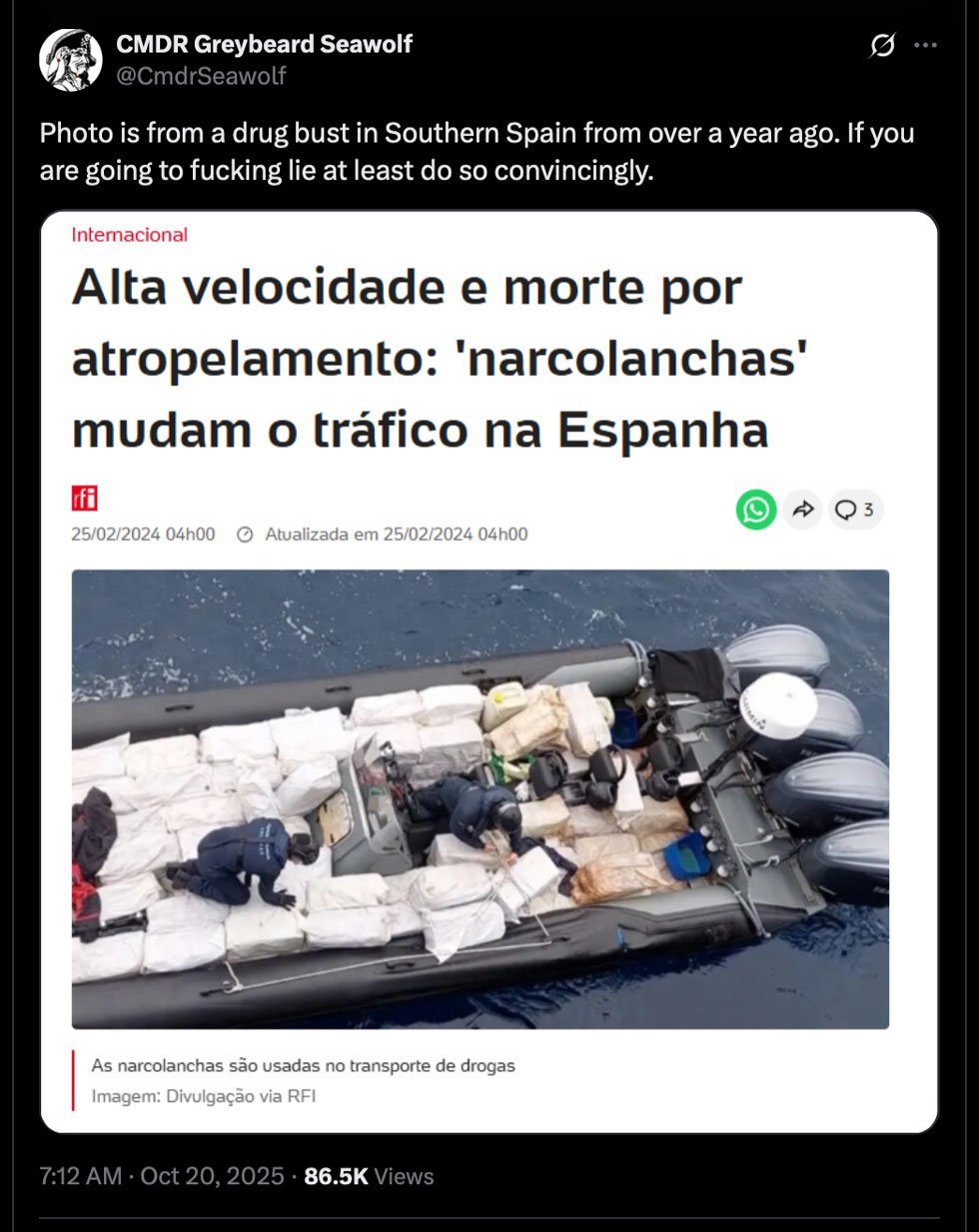 Almost immediately, social media users pointed out that the image was actually from a 2024 drug bust off the coast of southern Spain, roughly 1,000 kilometers south of the Canary Islands—nowhere near the Caribbean, and with zero connection to the incident in question.