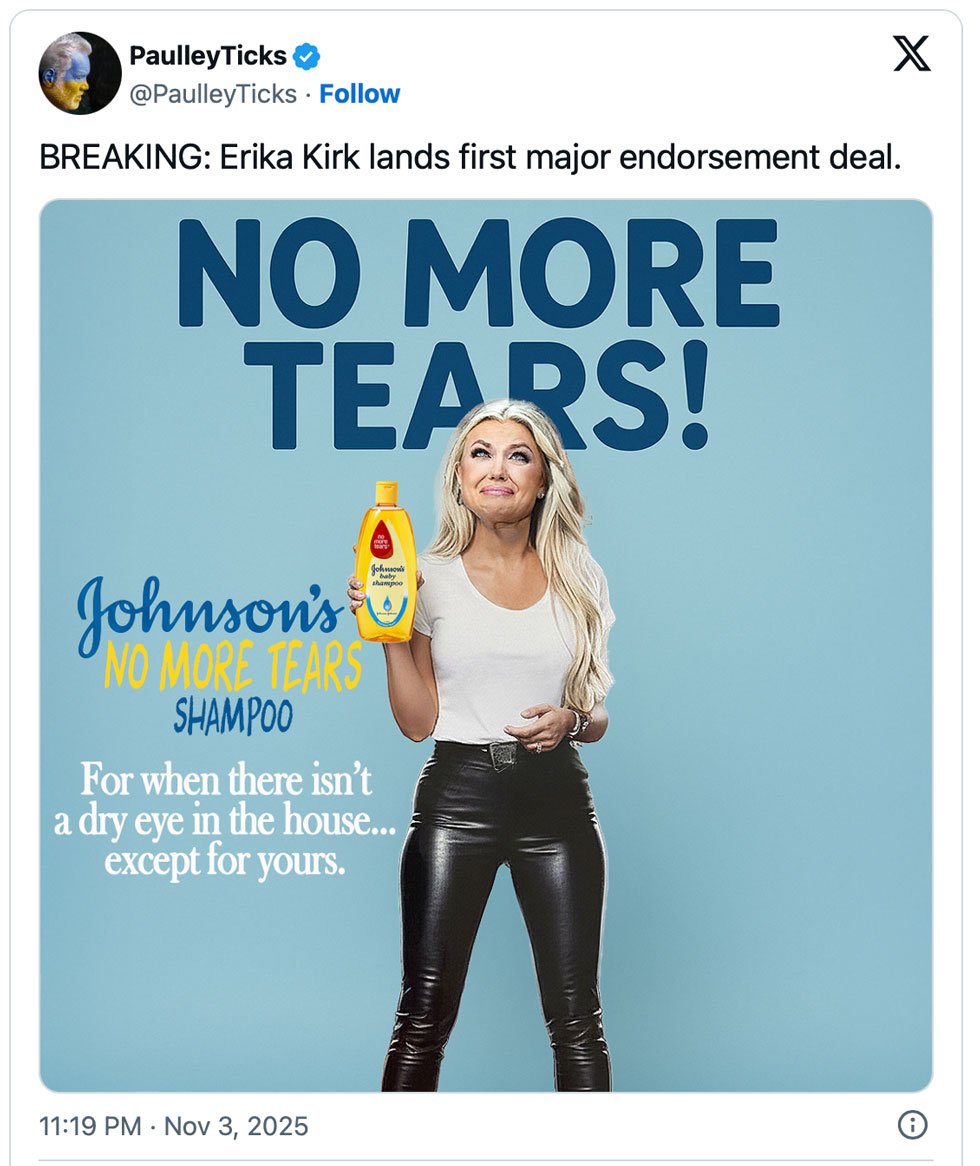 Now, the internet has turned that defiance into a meme. The “no more tears” line became a trending hashtag, with users joking that Erika Kirk had scored her “first major endorsement deal” with Johnson’s shampoo.